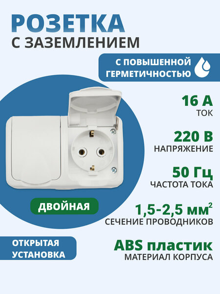 Электрические розетки предназначены для подключения электрооборудования к электрической сети. Они представляют собой часть соединителя, к которому проводится электрическая энергия от источника питания, могут использоваться в быту и на предприятиях. Горизонтальный блок из 2 розеток предназначен для подключения 2 устройств. Розетки могут быть использованы не только в сухих помещениях, но и в условиях повышенной влажности и пыльной среде, так как высокая степень защиты IP 54 сохраняет работоспособность изделия. Изделие оборудовано крышкой для защиты розетки от попадания пыли и брызг воды, такие розетки могут быть использованы на автомойках, в бассейнах, на территории спортивных площадок, террасах и других открытых местах. Корпус выполнен из ударопрочного, износостойкого и негорючего АБС-пластика белого цвета, используется в сетях до 250 В, на ток до 16 А, оснащен заземляющим контактом, который защищает человека от поражения электрическим током. Благодаря надежному устройству изделия срок службы розетки - 10 лет, а гарантийный срок – 24 месяца. Конструкция позволяет быстро и легко устанавливать розетки накладным методом монтажа и не требует дополнительных элементов крепления. Размеры 132х85 мм.