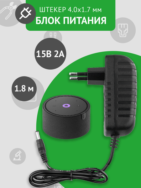 Блок питания 15В 2А для умной колонки Яндекс Станция Мини, универсальный, чёрный, штекер 4.0 x 1.7 мм, без индикатора работы