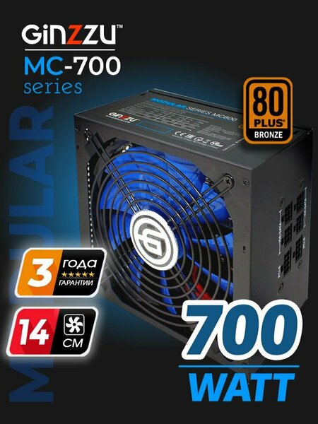 Блок питания MC700 представляет серию Ginzzu Modular версия ATX 2.3. Модели БП этой серии предназначены для комплектации мощных игровых домашних вычислительных машин, а также систем с несколькими графическими видеоадаптерами. Эти блоки питания разработаны для профессионалов. Они выдают всю свою мощь имено тем элементам которым она нужна. Ничего лишнего. Пользователь сам определяет, что ему нужно подключить. Масштабируемость позволяет расширять возможности без лишних проводов. Блоки этой серии имеют сертификат 80 Pluse Bronze. Схемотехника разработана Тайваньскими инженерами. В этой серии блоков питания используется решения современых сервеных систем. Четыре этапа тестирования в процессе производства и выпуска продукции позволяют использовать эти БП в ответственных системах требующих круглосуточной работы. Это дорогие и качественные блоки питания которые выдают стабильную заявленную мощность. Блоки питания этой серии комплектуются управляемыми 14-см вентиляторами охлаждения, обладают отличным набором VA характеристик. Все требованиям безопасности и электромагнитной совместимости на высоте, что подтверждено многочисленными сертификатами качества, как европейскими, так и российскими. Это серьезный блок питания для ответственных задач. Изготовитель предоставляет гарантию безупречной работы 3 года
