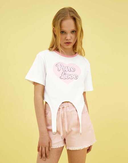 Молочный кроп-топ с имитацией подвязок произведёт модный фурор в любой компании! Изделие дополнено принтом в виде сердечка и контрастной отделкой горловины для акцента. Модель изготовлена из гладкого джерси с качественным хлопком в составе. Сочетай с объёмными джинсами, брюками карго или летящей юбкой из подростковой коллекции бренда «Глория Джинс». Детали: прямой крой Straight, укороченная длина, круглый вырез с контрастной отделкой горловины, короткие рукава, принт, подвязки с металлическими полукольцами. Гарантийный срок товара 30 дней.