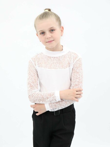 Блузка для девочки выполнена из кулира - легкого хлопкового полотна с лайкрой . Изделие с Длинными рукавами на манжетах , украшено кокеткой из тонкого ажурного полотна . Незаменимый предмет гардероба для юных школьниц ! Уход : только машинная стирка ( руками не стирать ! ) при температуре 40 градусов , без предварительного замачивания .