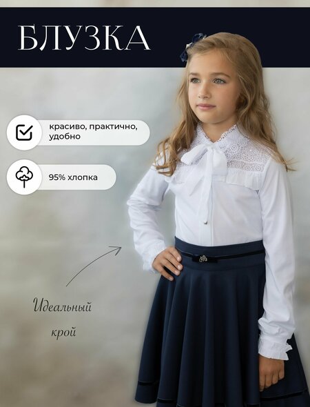 Модная блузка идеально подойдет для девочки, которая собирается в школу. Изготовленная из хлопка и эластана, она обеспечивает комфорт и легкость. Белая кружевная кокетка с узорами делает вещь праздничной и нарядной, добавляя элегантности в образ на первый звонок или любое другое торжественное событие. Блуза с длинным рукавом украшена кружевом и рюшами, что придает ей женственность и утонченность. Воротник с бантом добавляет классический акцент, а декоративные пуговицы служат стильным элементом отделки. Наша школьная форма станет базовым элементом гардероба для повседневного ношения или праздничных мероприятий. Блузка подходит для прогулок весной и летом благодаря своей легкости. Она также будет уместна осенью, когда начинается учеба. Ее можно сочетать с другими предметами одежды для создания стильного образа подростка. Кружевные вставки подчеркивают индивидуальность ребенка, делают вещь нарядной и праздничной. Более того такую блузку можно надевать с юбкой, сарафаном и брюками. Кофточка с кружевными деталями подойдет для школьной линейки 1 сентября, на повседневную носку в школу, на любые праздничные и официальные мероприятия.