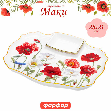 Блюдо для шашлыка "Маки" 28х21х2,3 см, с соусницей, объем соусницы - 60 мл, NEW BONE CHINA