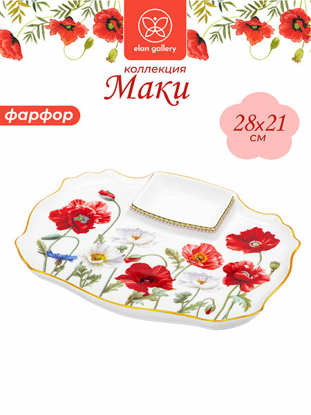 Блюдо Elan Gallery "Маки" размером 28х21х2,3 см с соусницей выполнено из фарфора нового поколения new bone china. Благодаря современным технологиям он не уступает другим видам фарфора в прочности, но при этом экологичнее в производстве. Объём соусницы – 60 мл, является неотделимой частью блюда. Серия "Маки" украшена красочным принтом с крупными цветами. Изображение красных и белых маков добавит ярких красок вашей кухне. Тарелка с соусником подойдёт для сервировки закусок, нарезки, блюд из мяса или рыбы. Очень удобна для подачи суши и ролл, так как вам не придётся искать отдельную ёмкость для соевого соуса. Сервировочное блюдо пригодится, чтобы создать идеальную атмосферу для приема гостей или романтического ужина дома. Возьмите это блюдо на дачу или пикник, чтобы использовать для шашлыка. Секция для соусов отлично подойдёт для кетчупа или майонеза. Не рекомендуется применять абразивные моющие средства. Можно использовать в микроволновой печи и мыть в посудомоечной машине. Поставляется в стильной картонной коробке. Эта тарелочка с отделением для соуса станет отличным подарком для любой хозяйки, которая ценит стильную сервировку. Благодаря красочной коробочке не понадобится дополнительная подарочная упаковка. В коллекции бренда Elan Gallery представлено много красивой посуды, кухонного инвентаря, предметов декора и других товаров для дома. Здесь вы найдёте всё для эстетичной сервировки, украшения интерьера и создания уюта!