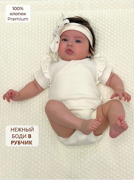 Нарядное детское боди на запах, с рюшами - крылышками на плечах, с коротким рукавом для новорожденной девочки выполнено из 100% хлопка, материал из которого он сшит называют или "в рубчик" или "из лапши". В боди Bebo легко одеть малыша, так как оно полностью распахивается, что очень удобно для младенцев, которые еще не могут держать голову, и имеет минимум кнопок, что облегчает процесс застегивания и растегивания. Наши боди кимоно на кнопках предлагаются в трех вариантах - с "крылышками" на рукавах или с воланом на груди, а также есть лаконичный вариант без декоративных элементов. Первые два варианта боди хороши для девочек, а третий подойдет и мальчикам тоже. Детское боди кимоно у первых двух размеров 56 и 62 имеет швы наружу, что обеспечивает максимальный комфорт для нежной кожи новорожденного. Две кнопки внизу бодика, позволяют легко менять подгузники. В зоне трусиков - сзади сделаны защипы, которые обеспечивают хороший охват подгузника, что в совокупности с правильным вырезом проймы под ножки хорошо скрывает сам подгузник и боди для малышей для мальчиков удобно облегает ножки малыша, не стесняя движений. Боди с коротким рукавом идеален для новорожденных на выписку в теплое время года и хорошо прогретых помещениях. Для пошива боди для малыша с коротким рукавом мы используем именно интерлок - самый гладкий и мягкий из всех видов хлопкового полотна, эта ткань гипоаллергенна, идеально подходит для нежной детской кожи, не пилингуется (не образует катышков), не вытягивается, идеально держит форму, дарит малышу комфорт и спокойствие. У боди с коротким рукавом вся окантовка также сделана из интерлока, а не из рибаны, так как он мягче и нежнее для детской кожи, чем рибана. Перед первым использованием вся нательная детская одежда для новорожденных первого слоя требуют обязательной стирки!