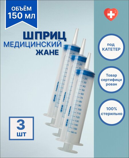 Шприц медицинский 150 мл жане одноразовый стерильный применяют для выполнения подкожных, внутримышечных инъекций и других лечебно-диагностических мероприятий, после использования утилизировать. Шприц 150 мл стерильный инъекционный трёхдетальный без иглы под катетер изготовлены из специального полипропилена и стерильно упакованы. Насечки на упоре образуют противоскользящий рельеф и исключают скольжение пальцев в процессе инъекции. Шприц жане / жанэ медицинский хранить при температуре от +4 до +25 С вдали от прямых солнечных лучей и влаги. Трехкомпонентный большой шприц 150 мл c наконечником под катетер. Шприц жане имеет плавный ход поршня за счёт резиновой манжеты на поршне. На прозрачной герметичной колбе нанесена шкала несмываемой краской до 160 мл. Модифицированный упор для пальцев, имеющий выраженную ребристость, позволяет надежно удерживать шприц во время работы. Стерильная блистерная упаковка из нетоксичного материала обеспечивает видимость шприца до вскрытия упаковки и свидетельствует о ее целостности. Особая форма резинового уплотнителя, благодаря идеальному положению на дне цилиндра, гарантирует введение полного объема лекарства. Шприц медицинский может быть использован как ирригатор, при питании через гастростому, шприц для смазки, Соответствуют: ГОСТ Р 52770-2007, ГОСТ ISO 7886-1-2011, ГОСТ ISO 7864-2011, ГОСТ ISO 8537-2011 и стандартам серии ГОСТ Р ИСО 10993-100. Форма и размер ободка вокруг цилиндра обеспечивают удобство и надежность захвата и удержания шприца в момент использования. Стерильно, апирогенно, нетоксично, для одноразового применения. Шприцы одноразовые медицинские также используют в косметологии, для косметических целей и подкожных процедур, как шприцы для уколов и инъекций, шприц для кормления животных или шприц автомобильный для смазки, шприц кондитерский . Производство Россия.
