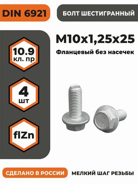 Болт фланцевый без насечек, высокопрочный, мелкий шаг резьбы. Болт российского производства. Применяемость: болт многофункциональный, изготовлен на автомобиль Камаз. Стандарт: DIN 6921. Можно использовать, как аналог ГОСТ ISO 4162-2014. Длина болта: 25 мм. Длина резьбы: 25 мм. Диаметр резьбы: 10 мм. Шаг резьбы: 1,25. Размер "под ключ": 15 мм. Класс прочности: 10.9. Покрытие: цинк-ламель. В соответствии со стандартами, длина болта измеряется от опорной части головки до конца фаски, которой завершается его резьбовой стержень.