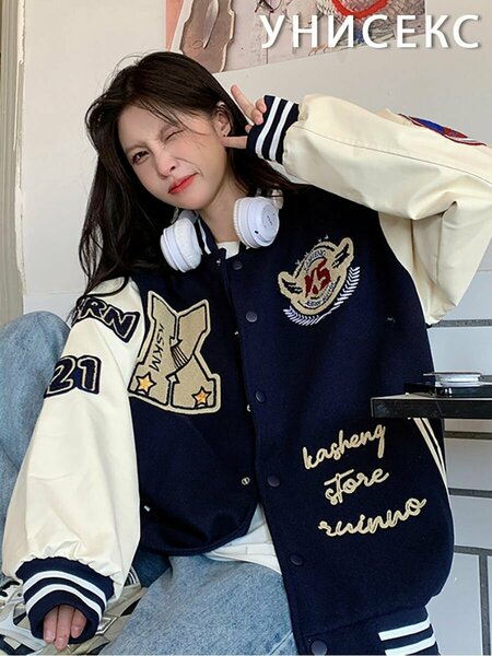 Женская кофта бомбер y2k выполненная в oversize стиле. Куртка бомбер ориентирована на девочек подростков в возрасте от 15 до 25 лет. Это демисезонный товар выполненный в винтажном стиле. Застежка бомбера реализована на кнопках, фактура материала напоминает замш или же бархат. Бомбер частично кожаный, а точнее его рукава, они выполнены из искусственной кожи или же экокожа. Бомбер с кожаными рукавами выполнен в винтажном стиле с принтом на спине в виде мягкой и стильной нашивки. Коричневый бомбер прекрасно будет носиться в осенний или весенний сезон, но если грамотно сочетать вещи, которые буду носиться вместе с ним, то даже зимний и летний сезон не будут для вас помехой. Также на передней части бомбера имеется надпись, расположенная рядом с прорезным карманном, карманы обшиты экокожей в виде стрелок, сами карманы прорезные. Женский бомбер для подростка очень модный и яркий. Его особенностью является то, что он довольно так и тонкий, что позволит без труда носить его даже летом. Бомбер выполнен из синтепона, синтетических волокон - полиэстера и спандекса. Благодаря тому, что он сделан из синтетических веществ, он очень теплый и может спокойно заменить вам вашу ветровку. Бомбер прекрасно подойдет для высоких полных девушек больших размеров за счет того, что бомбер очень широкий и свободный. Также хотим обратить ваше внимание на то, что бомбер для девочек с буквами, которая находится на передней части. При создании этой модели мы старались учесть все нюансы и сделали уклон в его спортивную стилистику, именно поэтому бобмер шикарно подойдет для спортсменов из таких дисциплин как футбол, баскетбол или же бейсбол. Школьный женский бомбер очень нарядный и прекрасно подойдет под юбку на физкультуру. Если вы уже ходите на работу и у вас нет четкого дрескода, то вам очень сильно повезло потому что женский бомбер прекрасно подойдет для носки в офисе благодаря тому, что он сочетает в себе классический стиль. Безусловно это отличный женский праздничный вечерний бомбер!