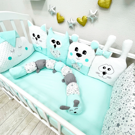 Комплект бортики в детскую кроватку обеспечит спокойствие родителей и комфорт для малыша с самого рождения. Это идеальное сочетание качества, безопасности и красоты. безопасно для детей 0+. Мы за безопасный сон, поэтому наши наборы шьются только из гипоаллергенных и натуральных тканей с маркировкой 0+. Комплект бортики сшит из 100% мягкого хлопка, структура ткани позволяет воздуху свободно циркулировать. Наполнитель бортиков - гипоаллергенный холлофайбер. Материал практичен, не вызывает аллергических реакций у новорожденных, прекрасно выдерживает многочисленные стирки и сушки в любой стиральной машине. Рекомендован для использования детям с рождения: малыш спокойно уснет в такой уютной и теплой кроватке сразу после выписки из роддома. Бортики в детскую кроватку с совами (звезды, мишка, зверята в зависимости от расцветки) удобно закрепить в кроватку, они легко крепятся с помощью репсовых лент с двух сторон. Подойдут бортики в прямоугольную кровать, также в кроватку овальную или круглую. Весь набор упакован в прочную сумку-переноску на молнии с ручками для удобства транспортировки. Все компактно и аккуратно упаковано, не занимает много места. Кому подойдут бортики. Их можно купить как для своего малыша, так и в подарок. Бортики для кровати также часто дарят на выписку из роддома. Поэтому бортик для ребенка - нужная покупка, которая подойдет в качестве подарка любой семье с новорожденным, вне зависимости от пола. особенности ухода. Чтобы бортик для детской кроватки прослужил долго и оставался в хорошем состоянии - ухаживайте за ним правильно. Рекомендуется деликатная стирка без жестких отбеливающих средств при 30 градусах, отжим не более 600 оборотов. Для стирки используйте специальные детские гели и не стирайте с другой одеждой, вещами для взрослых, полотенцами, пледами и т. д. Сушить строго в горизонтальном положении при комнатной температуре. После сушки при необходимости можно прогладить утюгом на режиме «хлопок» с использованием пара. Яркость ткани сохраняется даже после многочисленных стирок (при правильном уходе). Чтобы поддержать изделия в чистоте - стирайте их регулярно. ассортимент для ВАС. Комплекты бортиков в кроватку представлены в различных расцветках: мятный, серый, бежевый, пудровый и розовый, голубой. Каждый цвет интересен, можно подобрать то, что больше подходит под интерьер детской комнаты и нравится родителям. Подходят бортики для девочек и для новорожденных мальчиков. Комплектация товара в разных расцветках одинакова. отличная покупка. Ищите бортики на овальную, прямоугольную или любую другую детскую кроватку? Смело делайте заказ сейчас. Множество положительных отзывов о нашем товаре подтвердят его качество и необходимость в каждом доме, в котором появился малыш. Мягкий бортик создаст безопасное пространство в кроватке: защитит от ударов во время сна, подарит ощущение уюта и красоты. Кроме того, детям нравится смотреть на бортики игрушки, изучать их, трогать ручками бантики, рисунки звезд и зверушек. Все это создает комфорт и хорошее настроение.