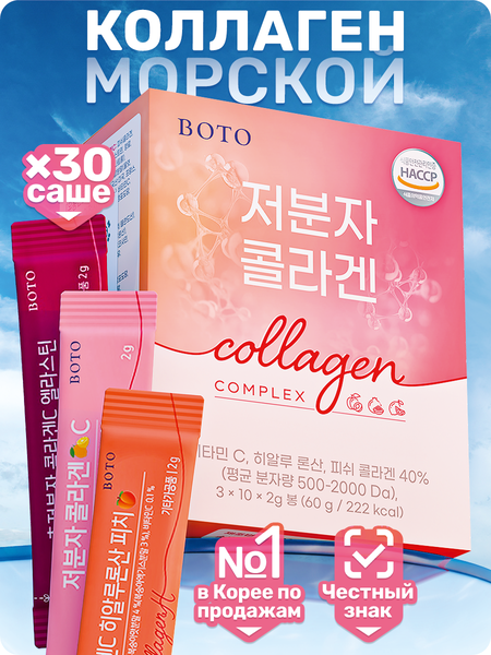 Выберите свой BOTO Collagen - корейский премиальный морской коллаген порошок в саше, в состав которого входит низкомолекулярный пептид рыбного коллагена, гиалуроновая кислота, витамин С, 17 видов лактобактерий. В комплексе собрано 30 пакетика саше - со вкусом лимона / персика / граната (усилен эластином) по 10 штук каждого - чтобы вы могли выбрать какой вкус коллагена вам подходит больше. С возрастом синтез коллагена в организме постепенно снижается (после 25 лет), а начиная с 40 лет резко замедляется. Морской коллаген бото (collagen) поддерживает формирование коллагена изнутри для сильной и красивой кожи, здоровых ногтей и волос. Добавка улучшает общее состояние кожи, способствует разглаживанию мелких морщин, повышает гладкость кожи, замедляет процессы старения (anti-age эффект), полезна вне зависимости от возраста - для девушек, женщин, пожилых людей. Регулярный прием морского коллагена повышает подвижность суставов, укрепляет связки и хрящевые ткани. Размер молекул рыбного коллагена на порядок меньше животного коллагена, что обеспечивает его высокую биодоступность и высокую скорость усвоения и действия. Натуральный состав добавки превосходит по полезным веществам женские бьюти - витамины. Суперфуд BOTO из Кореи поставляется в форме порошка. Способ применения: взрослым по 1 саше-пакету (2 г) в день. Порошок предварительно развести в 200 мл воды или сока, тщательно перемешать. Коллаген в форме порошка принимать удобнее, чем в капсулах или таблетках. Пакетики саше можно взять с собой на работу, в путешествие.
