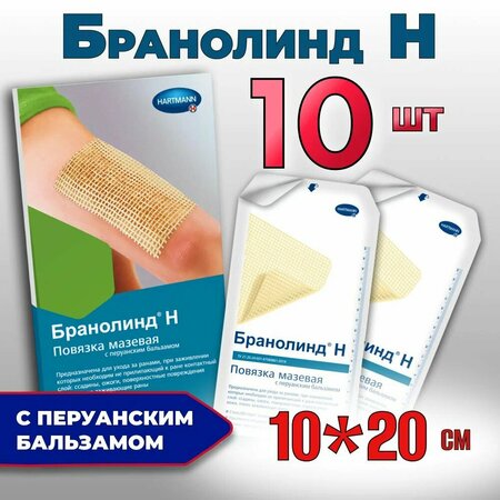 Повязка на рану Бранолинд Н 10х20 см. (комплект из 10 шт.) с мазью ранозаживляющей компании Хартманн выпускается в виде хлопковой крупноячеистой ткани которая пропитана специальным составом с перуанским бальзамом. Натуральная ткань мазевой повязки с крупными ячейками хорошо пропускает воздух и раневое отделяемое (экссудат), не мешая его оттоку от пораженных участков кожи. Стерильная антисептическая повязка Бранолинд Н служит как мазь для заживления ран, пролежней и ожогов, восстанавливает кожные покровы на тканевом уровне, предотвращая развитие вторичной инфекции. Перуанский бальзам, который является основным компонентом мазевого состава, содержит бензойную и коричную кислоты, ванилин и т. д, благодаря которым обладает антибактериальными и противовоспалительными свойствами. Медицинская повязка Бранолинд Н показана при гнойных ранах, язвах, пролежнях, порезах, ссадинах, рваных ранах, ушибах, ожогах, ранах после пересадки кожи. Высокая эффективность (тесный контакт повязки с кожей) замечается не только при терапии поверхностных, но и при лечении глубоких ран. Повязка Бранолинд H очень экономична в применении, так как вырезается по размеру раны (остальное нужно хранить в холодильнике). Смена повязки осуществляется 1 раз в 3 дня, если рана не мокнет. Мазевая повязка Бранолинд является незаменимым помощником в каждой домашней аптечке, на даче, в поездках на море, в путешествиях, в походах круглый год. Будет отличным средством и для аптечки на кухне при порезах и ожогах при приготовлении пищи. Рекомендуется также для спортсменов, для детей и для животных. Произведена на заводе Hartmann в России по немецким стандартам.