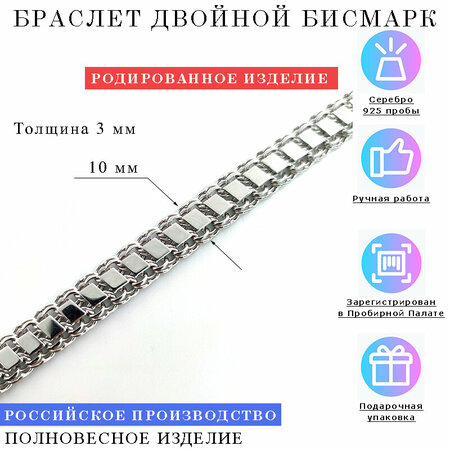 Браслет из серебра 925 пробы, плетение - бисмарк двойной полновесный, родированный. Ширина - 10 мм. Толщина - 3 мм Замок - Карабин. На поверхность изделия нанесен тонкий слой Родия (процесс родирования), за счет чего браслет еще больше блестит и играет на свету. Также Родий защищает ювелирное изделие от коррозии и износа. Обращаем Ваше внимание, что вес изделия в карточке товара указан средний. Фактический вес может незначительно отличаться как в меньшую, так и в большую сторону. Браслет произведен на территории Российской Федерации из сертифицированного высококачественного серебра. Подлинность изделии подтверждается наличием: пробы, именника производителя, бирки и пломбы производителя. На бирку нанесен УИН (уникальный идентификационный номер) конкретного изделия, по которому можно легко проверить подлинность изделия и соответствие заявленной пробе на сайте Пробирной палаты РФ. К украшению прилагается подарочная упаковка, что позволит Вам преподнести его в качестве подарка сразу после получения.