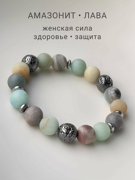 Женский браслет из натуральных камней, пробуждающих женскую силу, укрепляющих здоровье и дающих защиту. В составе амазонит, металлизированная вулканическая лава, вставки из гематита. Необычный способ обработки камня делает текстуру амазонита матовой, характеризуя женскую силу - мягкую, нежную и, одновременно, твердую.