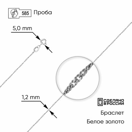 Полновесный браслет из белого золота 585 пробы плетения "Сингапур". Ширина цепочки 1,2 мм Изящный и тонкий, но надежный и прочный – это о полновесном браслете плетения "Сингапур". Он подойдет девушкам и женщинам, которые любят изящные классические ювелирные украшения. В браслете плетения "Сингапур" звенья соединяются между собой, постепенно закручиваясь. Украшение выглядит сдержано и элегантно. Благодаря алмазной огранке, браслет эффектно переливается на свету. Используйте браслет в качестве самостоятельного акцента для дневного образа. Полновесная технология производства браслета Сингапур (звенья цельные внутри) делает его прочным в носке и устойчивым к механическим воздействиям. Такой браслет прослужит вам долго! Браслет рекомендуется снимать на время сна и в душе, чтобы он дольше сохранил свой внешний вид.
