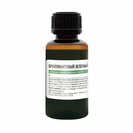 Состав на 100 мл действующее вещество: бриллиантовый зеленый - 1,0 г вспомогательные вещества: этанол (этиловый спирт) 95% - 56,0 г вода очищенная - до 100 мл