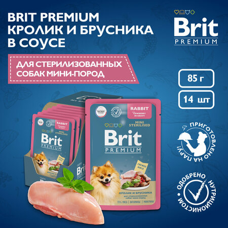 Брит Премиум влажный корм для собак мини пород, Кролик и брусника — это сбалансированный влажный рацион для стерилизованных питомцев. В составе 75 % мясных ингредиентов и натуральную бруснику — источник антиоксидантов и витаминов. Сбалансированная формула помогает поддерживать нормальный вес, улучшает пищеварение и укрепляет иммунную систему. Корм влажный для собак легко усваивается и подходит для ежедневного питания, дополняет сухой корм Брит Премиум. Преимущества: Специально для стерилизованных собак мини пород С кроликом и натуральной брусникой Поддерживает оптимальный вес Без сои и консервантов Условия хранения: Хранить при температуре от 0 до +25 °C. После вскрытия — в холодильнике, использовать в течение 48 часов. Рекомендации по кормлению: Следуйте нормам кормления, указанным производителем. У питомца всегда должен быть доступ к чистой питьевой воде.