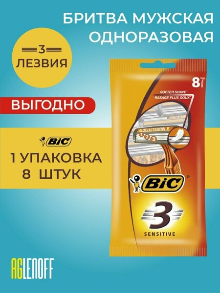 - Одноразовая бритва с тремя лезвиями и фиксированной головкой - идеальный выбор для мужчин, которые предпочитают качественное бритьё по разумной цене. Тройное лезвие разработано для чистого и комфортного бритья- Хромо-полимерное покрытие лезвий гарантирует их долговечность- Благодаря увлажняющей полоске, обогащенной алоэ вера и витамином Е, бритва плавно скользит по коже, повторяя контуры лица- Изогнутая ребристая ручка культового оранжевого цвета обеспечивает уверенный контроль во время бритья даже мокрыми руками. Мужская одноразовая бритва BIC 3 Sensitive для чувствительной кожи - идеальный выбор для более качественного бритья (в сравнении с одноразовыми двухлезвийными станками) по отношению цены и эффективности. Такой качественный мужской станок будет дарить вам ощущение чистоты и комфорта во время каждой процедуры бритья. Уже 45 лет компания BIC сохраняет лидерские позиции в сфере разработки и производства бритв. BIC - имя, которому можно доверять.
