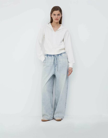 Достоинства:Широкие, из достаточно плотной джинсы. Очень приятный голубой цвет Недостатки:Непонятная посадка (если носить ниже талии - болтается пройма) Комментарий:Эта модель похоже пришла на смену «парашютам» из 2023 - очень похожая ширина штанины. Классные штаны для расслабленных образов