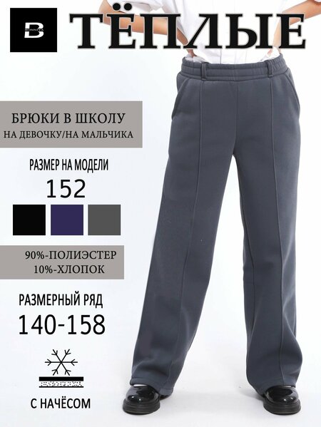 Внимание! Изделие отшивается из футера с начесом плотностью 250-260г\м2 («Еврозима») с составом 90% полиэстер, 10%-хлопок. Возможно незначительное образование катышков. Если для Вас катышки это принципиальный момент, лучше отказаться от заказа. Также просим Вас сравнить элементы изделия с параметрами Вашего тела и выбрать идеальный размер в размерной сетке в инфографике на фото, чтобы не ошибиться с размером. Бюджетные брюки подростковые палаццо в школу от BONNITA представляют собой идеальный выбор для активных и стильных подростков. Изготовленные из комфортного и прочного материала, состоящего из полиэстера 90%, хлопка 10%, эти брюки обеспечивают отличное сочетание функциональности и моды. Широкая модель и средняя посадка делают их универсальными для любых фигур, а утепление из футера позволяет носить их в холодное время года. Без подкладки и с ворсистой фактурой материала, брюки обеспечивают тепло и комфорт. Резинка на талии и шлевки на поясе для ремня добавляют удобство и стиль, а карманы в шве делают их практичными и удобными в повседневной жизни. Созданные для повседневных и спортивных назначений, таких как физкультура, любые активности и школьный день, эти брюки от SOUL TO SOUL - отличный выбор для тех, кто ценит качество и стиль.