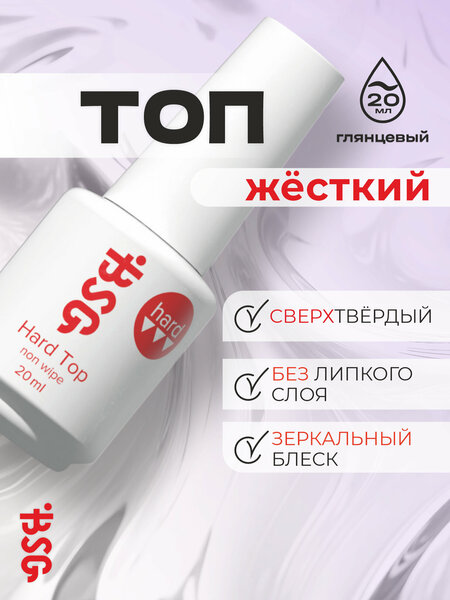 Hard Top - завершающий глянцевый топ без липкого слоя. Обладает повышенной жёсткостью и прочностью. Делает более крепким любое покрытие. Идеально подходит для нанесения на жёсткий цветной гель-лак BSG Adamant. Для белых оттенков советуем использовать Hard Top с повышенным содержанием УФ-фильтров.