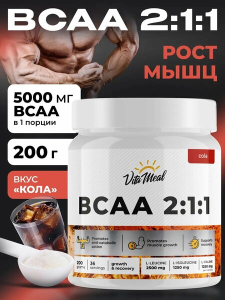 BCAA от VitaMeal - Незаменимые аминокислоты для роста мышц BCAA от VitaMeal (BCAA 2-1-1) - это комплекс аминокислот, который содержит незаменимые аминокислоты: L-лейцин, L-изолейцин, L-валин. Эти аминокислоты являются основными строительными элементами мышечной ткани и необходимы для ее защиты от катаболических процессов (разрушения) во время тренировок и других стрессовых ситуаций. Преимущества приема BCAA: - Поддержка здоровья и функции мышц во время тренировок. BCAA помогают увеличить мышечную массу, силу и выносливость, а также ускорить восстановление после тренировок. - Защита мышц от катаболизма и разрушения. Незаменимые аминокислоты BCAA способствуют поддержанию нормальной функции мышц и предотвращают их разрушение во время интенсивных тренировок. - Улучшение спортивных результатов. BCAA могут помочь улучшить спортивные результаты и повысить эффективность тренировок, особенно при выполнении высокоинтенсивных упражнений. - Снижение усталости и повышение энергии. Прием BCAA может улучшить общее самочувствие и повысить уровень энергии, снижая утомляемость и усталость. Принимайте BCAA до или после тренировок, смешивая порошок с водой или другими жидкостями. BCAA можно принимать как в виде порошка, так и в виде капсул. VitaMeal - это бренд, который предлагает широкий ассортимент продуктов для поддержания здоровья и достижения спортивных целей. Все продукты изготовлены из высококачественных ингредиентов, прошли строгую сертификацию и соответствуют высоким стандартам качества.