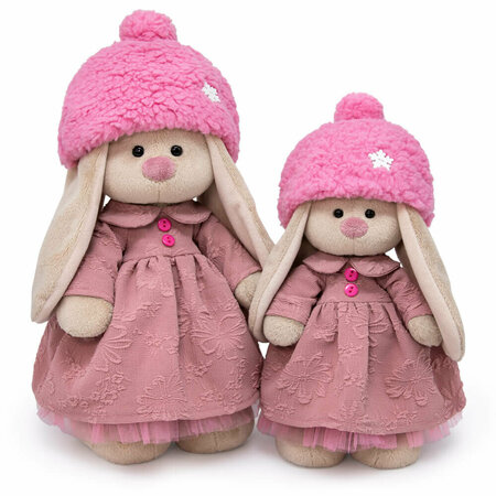 На Зайке Ми милое платье для прохладных дней цвета дикой розы, сшитое из плотной ткани с выработкой. Платье отрезное по талии, с длинным рукавом, круглым воротничком и с малиновыми пуговками спереди, а также с нижней юбочкой из нежно розовой сеточки. В комплекте теплая шапочка из меха цвета розового крема. Шапочка с круглым помпоном и украшена белой пуговкой снежинкой.