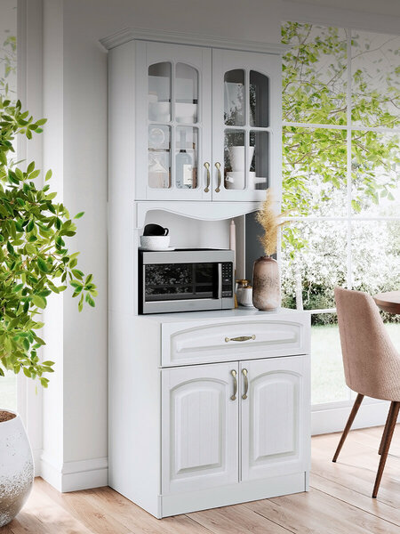 Элегантный качественный шкаф – обязательный атрибут любой кухни. Разработанный для хранения фарфора, столового серебра и всех кухонных принадлежностей, нет лучшего кухонного шкафа для хранения, чем классический шкаф. Настоящая основа классического американского дизайна, мы придали вневременному шкафчику современный вид, чтобы создать действительно удивительный шкаф! В нем достаточно места для одного большого кухонного прибора, вы можете разместить микроволновую печь, тостер или кофеварку, и при этом останется достаточно места для хранения. Почему мы так уверены, что вам понравится наш кухонный шкаф: Потому что это идеальное сочетание удобства и стиля. Мы сохранили классический дизайн клетки со стеклянными дверцами в верхней части, а также дополнительными полками и выдвижным ящиком внизу. Современный дизайн предлагает открытое пространство в центре для микроволновой печи или кофеварки. Неподвластный времени предмет с элегантными линиями и изящными ручками, окрашенный в безупречный белый цвет; Премиальное качество, изготовленное из ламинированной ДСП премиум-класса и МДФ для обеспечения повышенной долговечности; Универсальный, используйте шкаф на кухне, в спальне и даже в гостиной; Тихое закрывание дверей, добавлены резиновые амортизаторы; Простой в установке шкаф поставляется с пошаговым обучающим видео на YouTube; Решите все свои потребности в хранении на кухне стильно! классический СТИЛЬ: Вы ищете шкаф в классическом стиле? Классический шкаф для хранения — это неподвластный времени предмет, который добавит неповторимый штрих элегантности в любую комнату вашего дома! современный дизайн: мы усовершенствовали классическую тумбу для современных нужд, добавив открытое пространство, специально предназначенное для размещения одного бытового электрического устройства, такого как микроволновая печь, кофеварка или тостер, сохранив при этом полки для хранения. идеально для ваших потребностей для хранения: Кухонный шкаф имеет достаточно места для хранения; Вверху мы включили большое пространство для хранения, отделанное дверцами из закаленного стекла в рамке, а внизу добавили еще одно место для хранения с полками и выдвижной ящик. простота установки: установка кухонного шкафа еще никогда не была такой простой. Мы подготовили для вас пошаговое обучающее видео на YouTube. Все, что вам нужно сделать, это просто отсканировать QR-код, прилагаемый к шкафу! премиум качество: Наш кухонный шкаф идеально сочетает в себе высококачественный МДФ, ламинированную ДСП и стекло, чтобы создать настоящий шедевр. Наши мастера изготавливают кухонную мебель с единственной целью: качество.