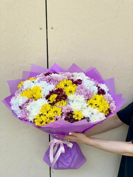 Букет из кустовых хризантем (микс) 21 шт. Хризантемы - символ осеннего великолепия и утонченности, они обладают уникальной способностью сохранять свежесть и красоту на протяжении долгого времени. В этом букете вы найдете микс различных оттенков и форм, что придаст вашему подарку еще больше индивидуальности и уникальности. Каждый букет изготавливается нашими флористами непосредственно перед доставкой, что гарантирует свежесть и качество цветов. Количество цветов: 21.0 Высота букета: 60.0 см Цвет: разноцветный Состав: хризантема кустовая Тип: монобукет Дополнительная информация: - Каждые два-три дня меняйте воду и подрезайте стебли секатором. Вода должна быть холодная - Используйте оберточную бумагу, крафт-бумагу или пленку для оформления букета Букет из кустовых хризантем (микс) 21 шт. - отличный выбор для любого повода, будь то 8 Марта, выпускной, День знаний, День матери, день рождения, день свадьбы, День святого Валентина, День учителя, Новый год, рождение ребенка или юбилей.