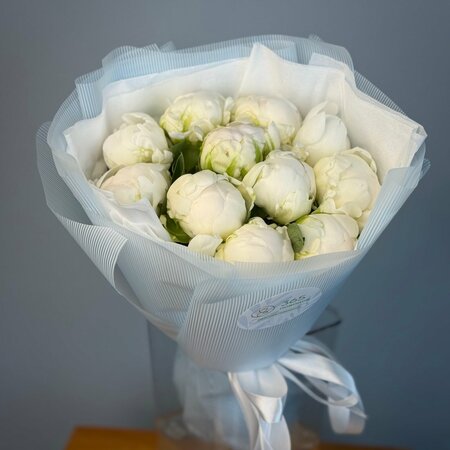 Букет из 11 белых пионов в стильной упаковке. «365 Поводов» - живые цветы с доставкой