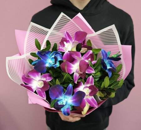 Букет из космических синих и розовых орхидей дендробиум с зеленью фисташки от Bestflo – это уникальное сочетание изысканности и утонченности. Этот букет станет прекрасным подарком для любого случая, будь то день рождения, юбилей, свадьба или просто знак внимания. Особенностью этого букета является сочетание космических синих и розовых орхидей дендробиум. Эти цветы имеют насыщенный и яркий цвет, который будет радовать глаз и вызывать восхищение. Зелень фисташки добавляет букету свежести и легкости, делая его еще более привлекательным и необычным. Букет от Bestflo – это не просто подарок, это выражение вашей любви и заботы. Выбирая букет из космических синих и розовых орхидей дендробиум с зеленью фисташки от Bestflo, вы делаете ставку на качество, стиль и уникальность.
