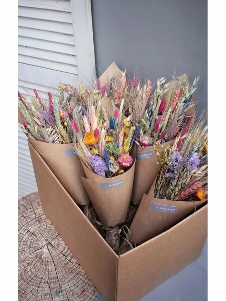 Прекрасные букеты из сухоцветов выращенных на нашей ферме. Букеты собраны вручную, из растений, поэтому состав травинок и цветов +/- может незначительно отличаться от фото. Цветовая гамма соблюдена. Не осыпаются, с нежным полевым ароматом. Прекрасный букетик. Можно поставить в вазу дома или приобрести в качестве подарка. Высота букета примерно 35-38 см. В составе более 7 наименований сухоцветов. Комплектация 1 букет в крафт-бумаге и индивидуальной прочной коробке для пересылки. Всего 50-60 стеблей.