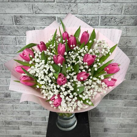 Букет из тюльпанов и гипсофилы - это сочетание нежности и элегантности, которое придется по вкусу каждой девушке. Букет состоит из двух видов цветов: тюльпанов и гипсофилы. Тюльпаны - символ любви и нежности, а гипсофила добавляет воздушности и легкости. Букет выполнен в розовых и белых тонах, что делает его ярким и запоминающимся. Такой букет будет отличным подарком на любой праздник или просто без повода. Букет из тюльпанов и гипсофилы подойдет для любой. Он будет прекрасным подарком для бабушки, мамы, любимой, коллеги или ребенка. Такой букет будет радовать получателя своей красотой и свежестью долгое время. Выбирая этот букет, вы делаете отличный выбор в пользу качества, красоты и свежести. Правильный уход за цветком не мало важная часть! Рекомендации по уходу за букетом:
