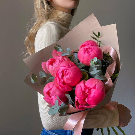 Букет из ярких пионов с веточками эвкалипта в авторском оформлении