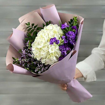Гортензия,Листья фисташки,Лимониум,Маттиола кустовая ,Упаковка в ассортименте,Лента,Плёнка прозрачная.