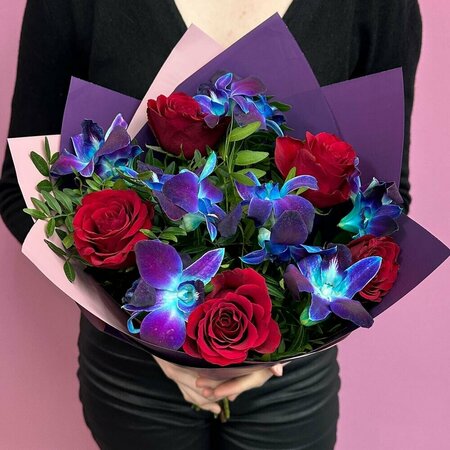 Букет из синей орхидеи дендробиум и красной розы - это потрясающее сочетание красоты, необычности и изысканности. Синяя орхидея дендробиум приковывает взгляды своей уникальной окраской, а яркая красная роза добавляет букету романтичности и мягкости.