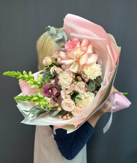 Букет с орхидеей и французской розой в нежной упаковке от Skyflora