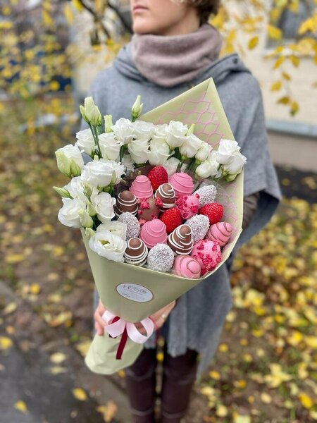 Букет с цветами Berry mood 1 - это уникальное сочетание вкуса и красоты. Букет состоит из клубники в молочном и белом шоколаде, украшенной кондитерским красителем. Посыпки на клубнике в шоколаде включают кокосовую стружку и сублимированную малину, что придает букету еще больше изысканности. Упаковка букета однотонная, украшена бантом из атласных лент. Это делает его не только вкусным, но и стильным подарком. Букет Berry mood 1 имеет вес 300 грамм и состоит из 3 цветов: эустомы красного, коричневого, белого, оранжевого и розового цветов. Высота букета составляет 45 см. Букет подходит для подарка на день рождения, День матери и другим особым случаям. В целом, букет с цветами Berry mood 1 - это отличный выбор для тех, кто хочет подарить что-то особенное и вкусное.