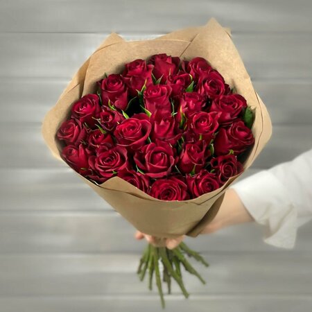 На фото букет из 25 роз. Букет из 21 цветка олицетворяет постоянство, уважение и благополучие Розы передадут Вашу радость, любовь и счастье. Красные розы означают смелость, страсть, красоту и любовь. Уход за кенийскими розами. Чтобы букет из розы Кении простоял как можно дольше, важно соблюдать некоторые базовые правила по уходу. Хранить розы следует в прохладном помещении. На букет не должны попадать прямые солнечные лучи. Держать букет следует в емкости со свежей водой. Периодически следует менять воду. Вода должна быть прохладной. Для хранения в вазе нужно подрезать стебли под углом, а также удалить нижние листья и шипы, которые находятся в воде.