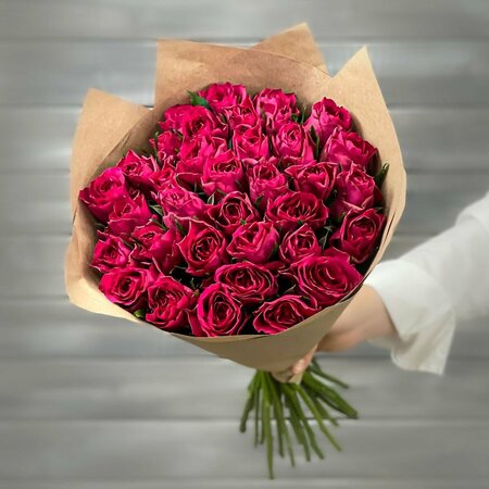 На фото букет из 35 роз. Большие букеты из 33, 35, 37 и более цветов дарят на день рождения и юбилеи. Они демонстрируют щедрость и уважение. Розы передадут Вашу радость, любовь и счастье. Малиновые розы символизирует вежливость, учтивость, любезность, элегантность и изысканность. Их можно подарить преподавателю, ко дню всех влюбленных. Уход за кенийскими розами. Чтобы букет из розы Кении простоял как можно дольше, важно соблюдать некоторые базовые правила по уходу. Хранить розы следует в прохладном помещении. На букет не должны попадать прямые солнечные лучи. Держать букет следует в емкости со свежей водой. Периодически следует менять воду. Вода должна быть прохладной. Для хранения в вазе нужно подрезать стебли под углом, а также удалить нижние листья и шипы, которые находятся в воде.