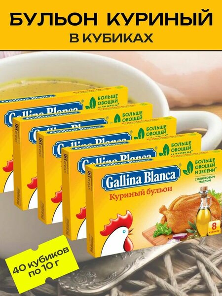 Куриный бульон Gallina Blanca в кубиках, 10 г. Галина Бланка — одни из самых популярных куриных кубиков. Приправа для курицы отлично подходит для бульона, она придает по-домашнему приятный аромат готовому супу. Куриный бульон приправа универсальное дополнение практически к любому блюду. Даже простой гарнир в виде гречки или макарон заметно преобразиться и станет невероятно вкусным вместе с куриным кубиком. Приправа для курицы делает бульон привлекательного золотистого цвета. Ароматика прессованного кубика приправы аппетитно наполнит своим запахом всю кухню и соберёт семью за трапезой. Приправа отлично дополняет рис, картофель, вкусно сочетается с блюдами в духовке и даже подходит для пельменей. Универсальная куриная приправа на все случаи жизни. Кубики не содержат вредных красителей и консервантов, только натуральный состав. Способ применения неимоверно прост. На 1 л воды добавляется 2 куриных кубика за 3-4 минуты до готовности.