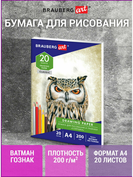 Папка с бумагой для рисования и графики BRAUBERG ART CLASSIC — идеальный выбор для творческих людей. Содержит 20 листов ватмана гознак, формата А4 (210х297 мм), плотностью 200 г/м2. Эти плотные и гладкие листы идеально подходят для сухих техник рисования, таких как карандаши, фломастеры, графитные мелки и линеры. Бумага устойчива к истиранию, обеспечивая долговечность ваших работ. Также подходит для черчения и использования маркеров с подложкой. Обложка изготовлена из качественного мелованного картона, защищая листы. Эта бумага для рисования — отличный выбор для тех, кто ценит качество и долговечность. Ватман гознак обеспечивает надежность и высокие стандарты, делая вашу работу еще более профессиональной. • Тип товара: ватман для рисования. • Серия: нет. • Вид работ: для эскизов. • Количество листов: 20. • Формат: А4. • Ширина: 297 мм. • Длина: 210 мм. • Обложка: картонная. • Внутренний блок: ватман гознак. • Цвет внутреннего блока: белый. • Плотность внутреннего блока: 200 г/м2. • Тип скрепления: нет. • Без кислот: да. • Цвет обложки: с дизайном. • Индивидуальная упаковка: да. • Артикул производителя: 114492.