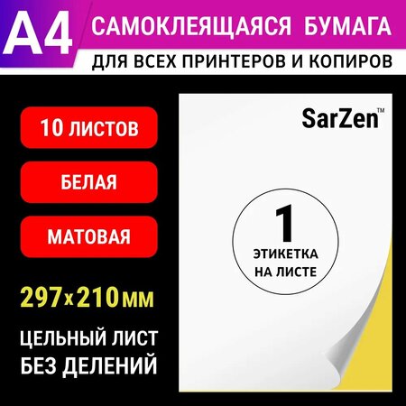Бумага самоклеящаяся белая матовая для принтера А4, 10 листов (цельный лист без делений - 1 одна этикетка, самоклейка для печати на принтере стикеров, штрихкодов маркетплейсов, ярлыков и творчества)
