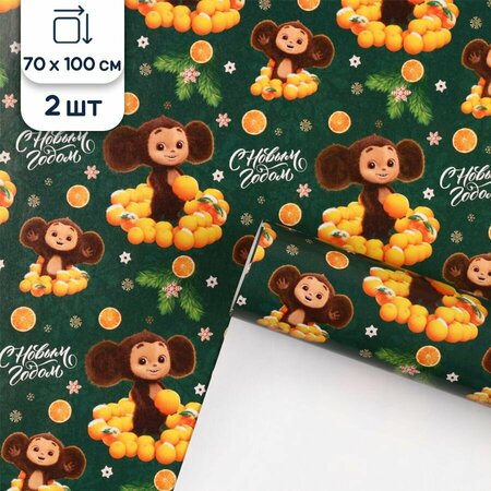 Бумага упаковочная для подарков новогодняя, Чебурашка, 70х100 см, 2 шт.