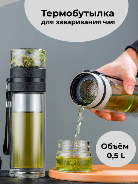 Бутылка для заваривания объемом 500мл. С помощью специальной мембраны вы можете легко отделить заварку от горячей воды и наслаждаться любимым чаем. Налейте кипяток в одно отделение и положите чай в другое отделение, переверните кружку , подождите и переверните обратно и можно наслаждаться чаем. Вы можете использовать эту кружку для заваривания в любом месте - дома, на работе, в поездке. Двойное стекло предотвращает быстрое остывание кипятка. Кружка имеет стильный дизайн и высокое качество исполнения.