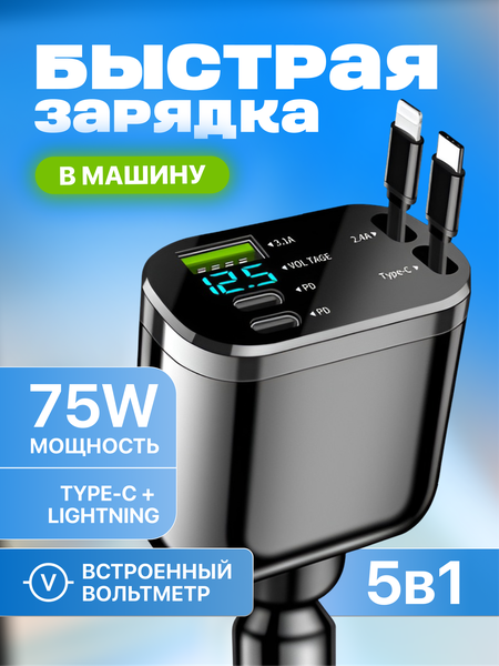 Многофункциональное автомобильное зарядное устройство 5 в 1 с вольтметром и подсветкой Быстрая автозарядка в прикуриватель позволяет одновременно заряжать до пяти устройств, благодаря двум встроенным кабелям (Type-C и Lightning) и трём разъёмам (USB и Type-C). Подходит для большинства современных гаджетов — телефонов (Samsung, iPhone, Xiaomi и др.), планшетов, наушников, видеорегистраторов и даже ноутбуков. Встроенные кабели длиной 70 см оснащены выдвижным механизмом: можно регулировать длину одним движением, а при повторном вытягивании они автоматически втягиваются обратно. Внутри автозарядки стоит технология Quick Charge 3.0, что обеспечивает быструю зарядку гаджетов. Встроенный вольтметр с цифровым дисплеем позволяет контролировать напряжение бортовой сети автомобиля, предотвращая перегрузки и продлевая срок службы электроники. Прочный корпус эффективно отводит тепло, предотвращая перегрев, а встроенный чип стабилизации напряжения защищает устройства от скачков. Зарядка надёжно фиксируется в прикуривателе даже во время движения, а угол поворота 360 градусов обеспечивает удобство использования. Подсветка помогает легко найти разъём в темноте, а дополнительный адаптер делает устройство совместимым с разными моделями автомобилей. Этот зарядный блок станет незаменимым устройством для всех, кто часто находится в дороге. Отличный подарок для водителей — мужчин и женщин, на день рождения, Новый год, 23 февраля, 9 мая и другие праздники.