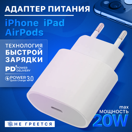 Быстрая зарядка для iPhone и iPad: адаптер питания и сетевое зарядное устройство Адаптер питания для айфона обеспечивает быструю зарядку и защиту мобильного устройства от перегрузки и короткого замыкания. Компактное зарядное устройство USB-C мощностью 20 Вт позволяет зарядить аккумуляторную батарею телефона до 50 % уровня заряда всего за полчаса. Зарядное устройство для телефонов поддерживает технологии PD3.0, QC3.0 и QC2.0, Huawei FCP/SCP, Samsung AFC и другие протоколы быстрой зарядки. Корпус изготовлен из прочного и приятного на ощупь пластика, что делает устройство практичным и удобным в повседневной эксплуатации. Зарядка для телефона совместима с любыми устройствами, оснащенными портом USB-C, TYPE C. Кабель в комплектацию зарядного устройства не входит, но адаптер упакован в надежную фирменную коробку. Список совместимых устройств включает iPhone 13 Pro, iPhone 13 Pro Max, iPhone 13 mini, iPhone 13, iPhone 12 Pro, iPhone 12 Pro Max, iPhone 12 mini, iPhone 12, iPhone 11 Pro, iPhone 11 Pro Max, iPhone 11, iPhone SE (2-го поколения), iPhone XS, iPhone XS Max, iPhone XR, iPhone X, iPhone 8, iPhone 8 Plus, iPad Pro 12,9 дюйма (4-го поколения), iPad Pro 12,9 дюйма (3-го поколения), iPad Pro 12,9 дюйма (2-го поколения), iPad Pro 12,9 дюйма (1-го поколения), iPad Pro 11 дюймов (2-го поколения), iPad Pro 11 дюймов (1-го поколения), iPad Pro 10,5 дюйма, iPad Air (4-го поколения), iPad Air (3-го поколения), iPad (8-го поколения), iPad (7-го поколения), iPad mini (5-го поколения), AirPods Pro, Galaxy S20, S21, A51, A50, A40, S10, S9, S8, Z Flip, A80, A70, A20e, M30, M20; Huawei P30, P30 Pro, P40 Pro, P20; Xiaomi Mi 9, 8, Mi 6, Mi A3, A2; Google Pixel 4, 4XL, 3XL и другие. Назначение: Для аудио- и телевизионной техники, Для геймпада, Для мобильных телефонов, Для наушников, Универсальные, Для офиса, Для планшетов, Для смартфонов, Для смарт-часов, Для устройств Apple, Для устройств на Android, Для сетевого оборудования, Для фото- и видеотехники, Для GPS-навигаторов, Для видеорегистраторов, Для игровых приставок, Для печатающих устройств, Для светодиодных лент, Для электронных книг, Для муз. инструментов Быстрая зарядка для iPhone и iPad: адаптер