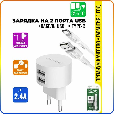 Быстрая зарядка для телефона на 2 USB с кабелем Type-C в комплекте / для смартфона Android / сетевое зарядное устройство / адаптер питания / BOROFONE BA23