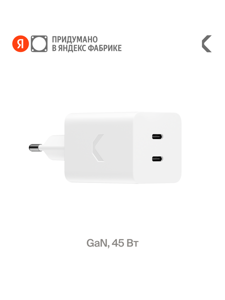 Commo 45W Plus Charger — зарядное устройство, придуманное в Яндексе. Эффективное и компактное, благодаря технологии чипов GaN. Два порта USB-C для зарядки двух девайсов одновременно. Устройство поддерживает Power Delivery 3.0 — технологию быстрой зарядки — и может зарядить смартфон на 50% за полчаса. Функциональный и продуманный, Plus Charger оснащён защитой от перегрева и перегрузок.