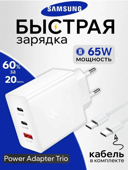 Сетевое зарядное устройство Samsung на 3 порта максимальной мощностью 65W в комплекте с кабелем Type-c на Type-c - это универсальная зарядка, которая позволяет заряжать три устройства одновременно и подходит для большинства гаджетов включая телефоны, планшеты, а так же наушники, фитнес браслеты и часы. Адаптер имеет 3 разъема (3 в 1): два USB-C (max мощность 65 и 45 Вт) и один USB -A ( на 15 Вт). Этот зарядный блок поддерживает быструю зарядку 65W, Super Fast Charging (25W) и Super Fast Charging 2.0 (45W). Супер быстрая зарядка версия 2.0 работает, когда ваше устройство поддерживает технологию PD 3.0 PPS (Power Delivery) и имеет порт Type С. В этом случае СЗУ 45W тайп си обеспечит максимально возможную скорость подзарядки. Если ваш девайс не поддерживает супербыструю подзарядку, то оно будет заряжаться в обычном режиме с мощностью 15W. Для использования блока питания самсунг 65 Вт необходимо подключить его к розетке с помощью вилки, а затем подключить шнур тайп си к порту на вашем устройстве. Этот оригинал адаптер белого цвета со входом тайп си - это мощное зарядное, которое обеспечивает высокую скорость заряда ваших гаджетов. Используя адаптор вы можете зарядить свой смартфон Samsung Galaxy , планшет, используя тайп си штекер. Этот блок питания также подходит для других девайсов на android (андройд, андроид) с USBC, а так же для смартфонов на ios - iphone, что делает его универсальным аксессуаром. Зарядник 65Вт имеющий разъем typec - это идеальный выбор и отличное решение для тех, кто хочет скорее зарядить свои мобильники и не желает тратить много времени на ожидание долгой подзарядки. Travel adapter подойдет как для повседневного использования, так и для поездок и командировок, где быстрая зарядка будет особенно важна.