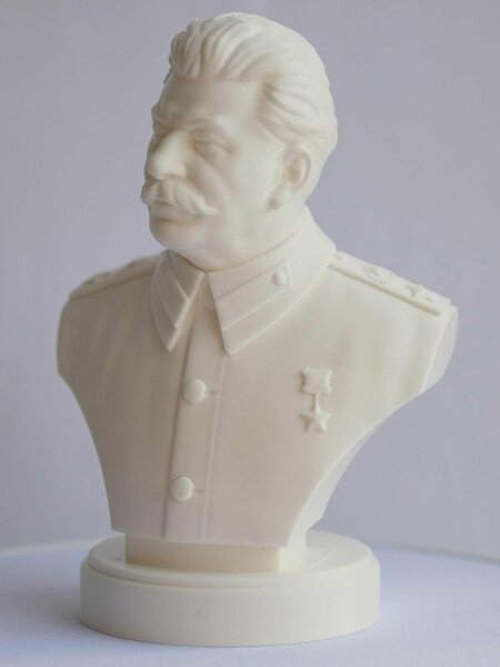 Бюст: Сталин Иосиф Виссарионович, советский политический, государственный, военный и партийный деятель, российский революционер, вождь, Маршал Советского Союза (1943), Генералиссимус Советского Союза (1945). Бюст высотой 12,5 см, визуально в объёме выигрывает в 2 раза по сравнению с бюстом высотой 10 см. Масса изделия составляет 45 г. Бюст изготовлен из ABS пластика, методом FDM-печати. Этот метод дает преимущество перед традиционным изготовлением из гипса в прочности, лёгкости. Также, при изготовлении, доработке 3D-модели и подготовке к печати, мы добиваемся наибольшей возможно-высокой детализации продукта, что выгодно отличает нашу продукцию от конкурентов. Изделие не подготовлено к покраске, перед окрашиванием необходимо сгладить поверхность в ацетоновой паровой бане и/или тщательно ошкурить, загрунтовать в несколько слоёв, желательно качественным грунтом для данного вида пластика. Уважаемые покупатели, если Вы не обладаете необходимой квалификацией, или не уверены в результате, НЕ окрашивайте! изделия, метод FDM/FFF печати - это послойное наплавление пластика, при окрашивании возможно проявление горизонтальных слоёв толщиной 0.2 мм.